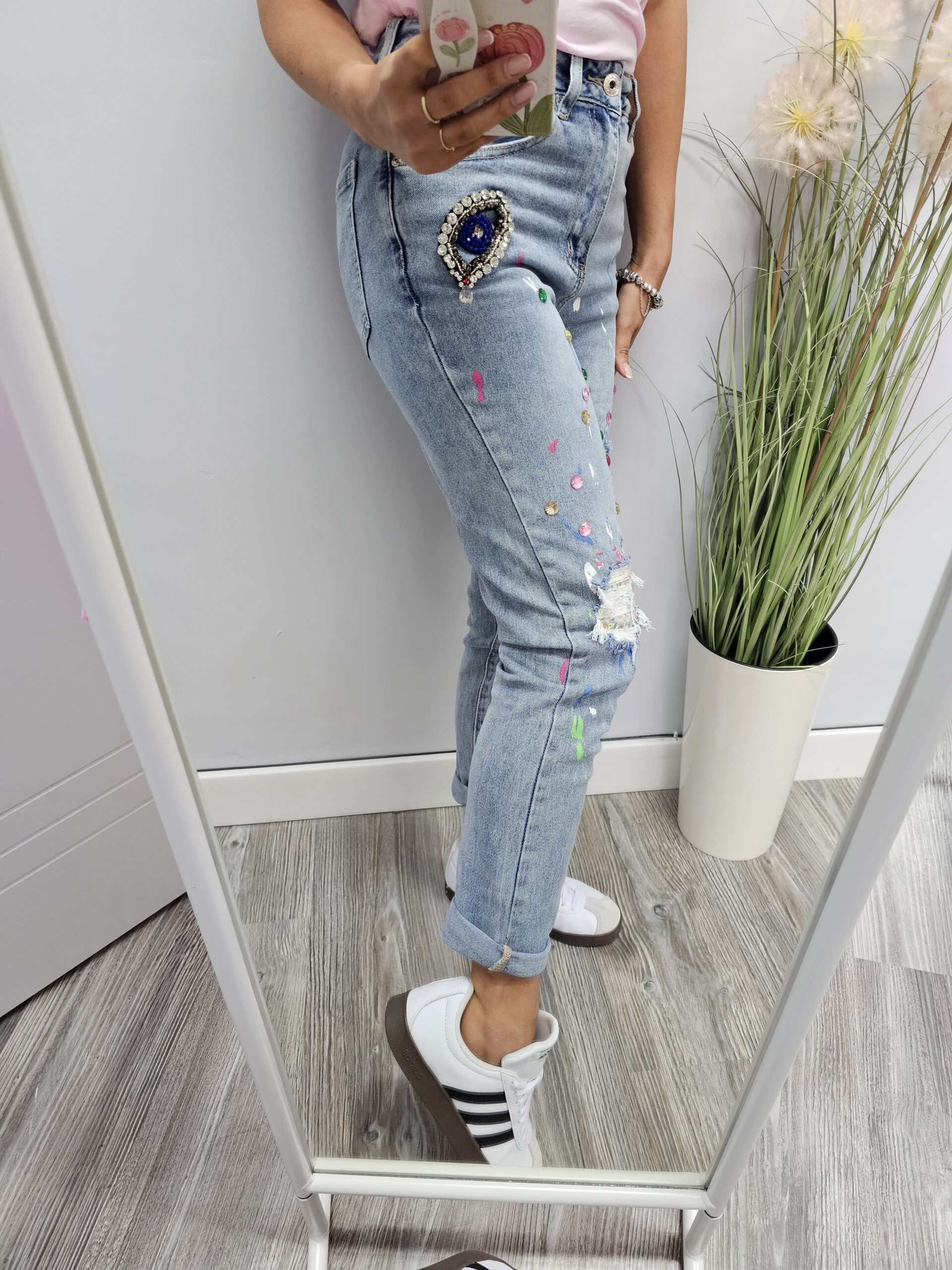 Opis: Jeansy MOM FIT, bardzo wygodne, stylowe, elastyczne, ponadczasowy wzór pasujący do wielu stylizacji, zapinane na guzik z zamkiem, rozmiar XS uciąga się do S, rozmiar M uciąga się do małej L