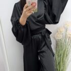 Opis: Komplet spodnie plus bluzka Bluzka , szerokie rękawy zakończone ściągaczem, wiązana. Spodnie krój prosty z gumką w pasie.