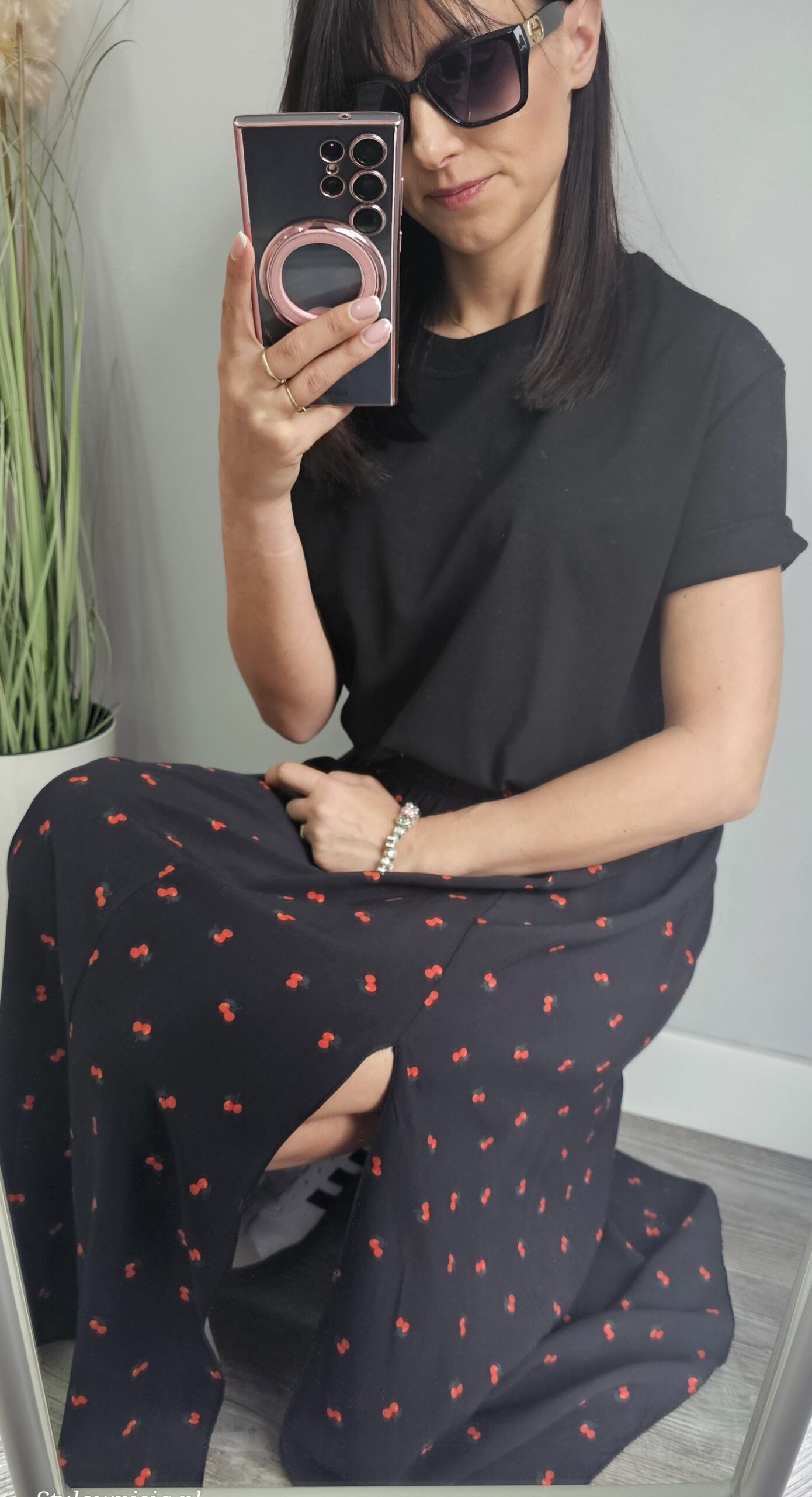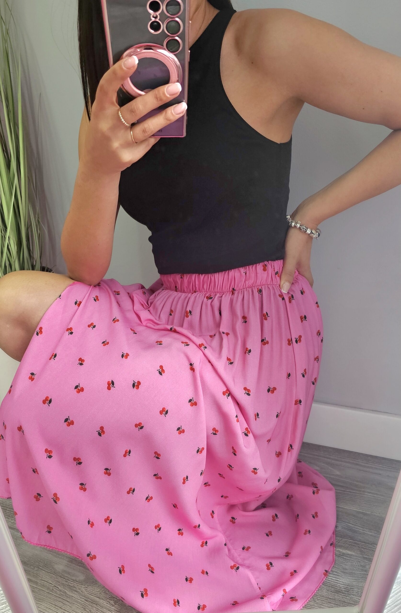 Opis: Spódnica Włoska z printem wisienki,rozcięcie po lewej stronie,w pasie gumka, lekka, zwiewna