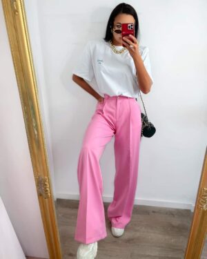 Opis: Spodnie materiałowe proste zapinane na 2 guziki od środka, zamek, w pasie z tyłu gumka. Zarówno na elegancko jak i do trampek.