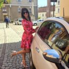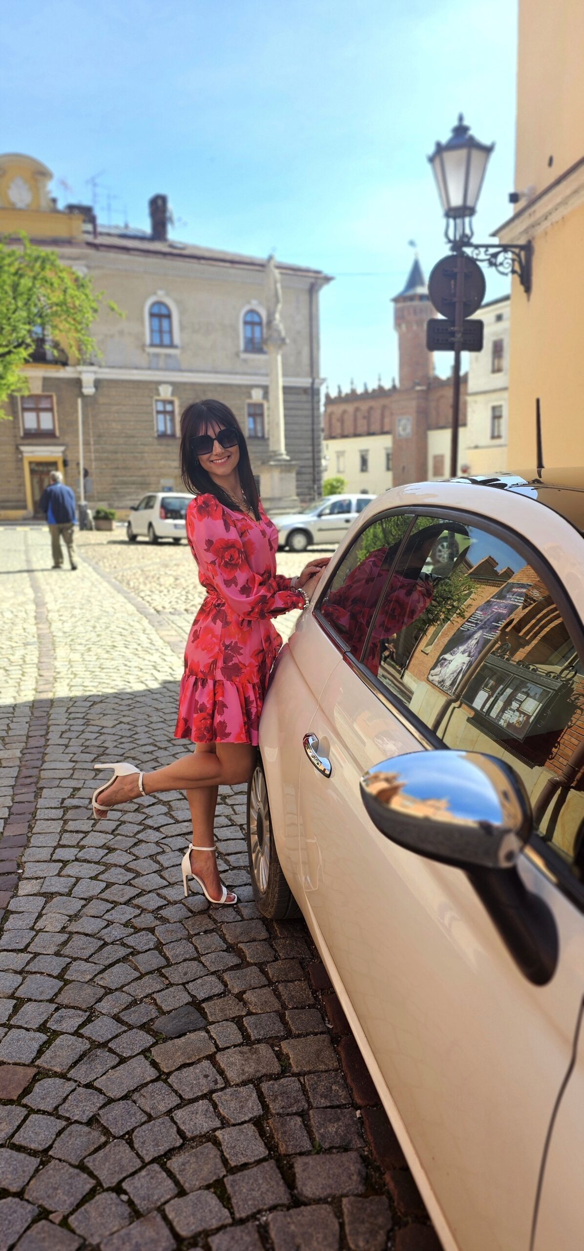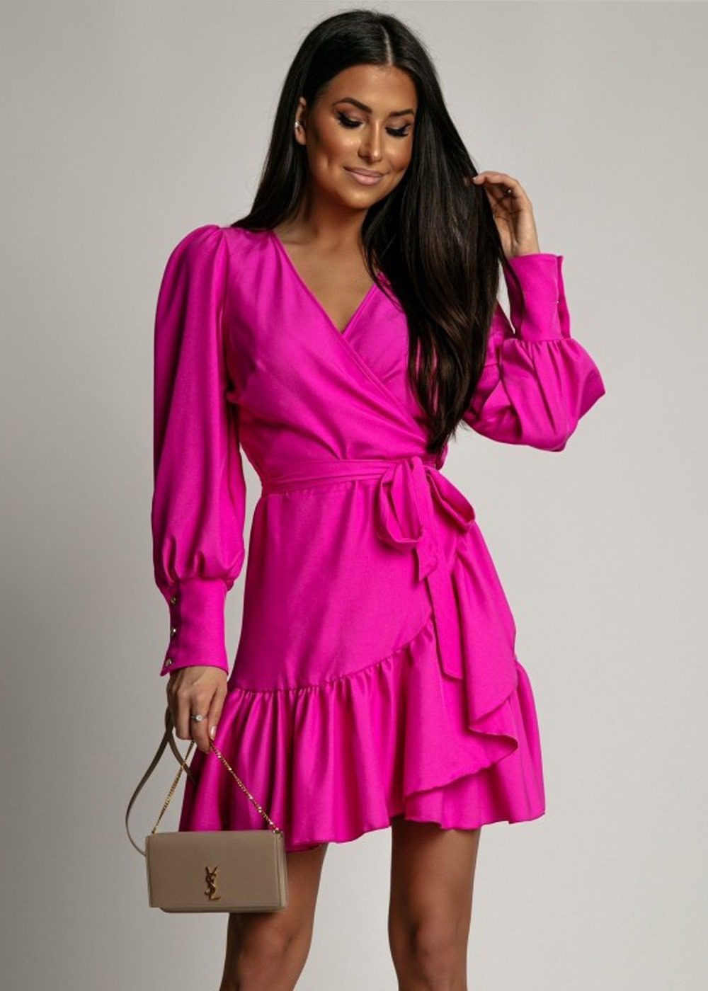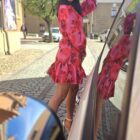 Opis: Sukienka wiązana, dołem falbanka, modny print kwiatów, szerokie mankiety na guziki