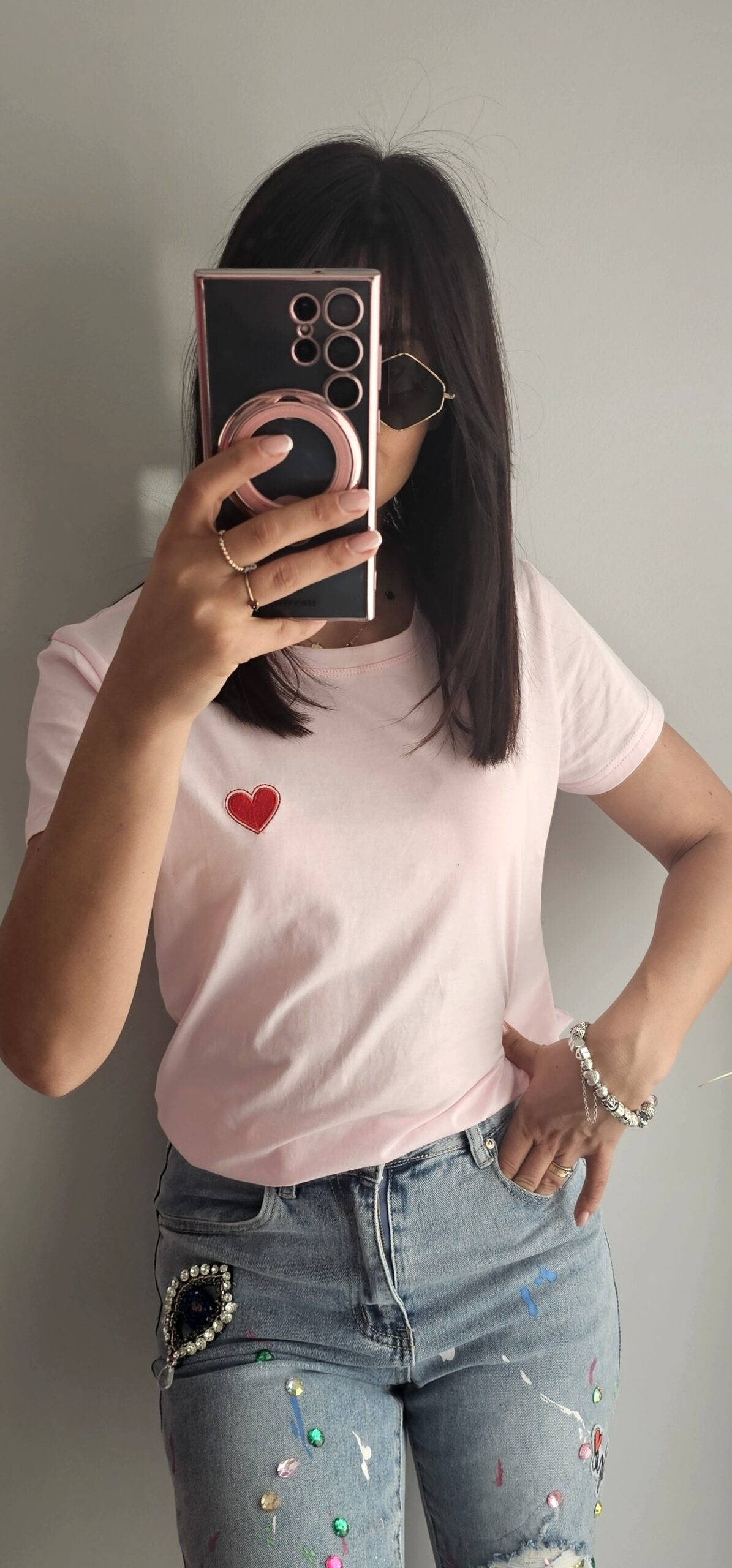 Opis: T-Shirt bawełniany z haftowanym czerwonym serduszkiem